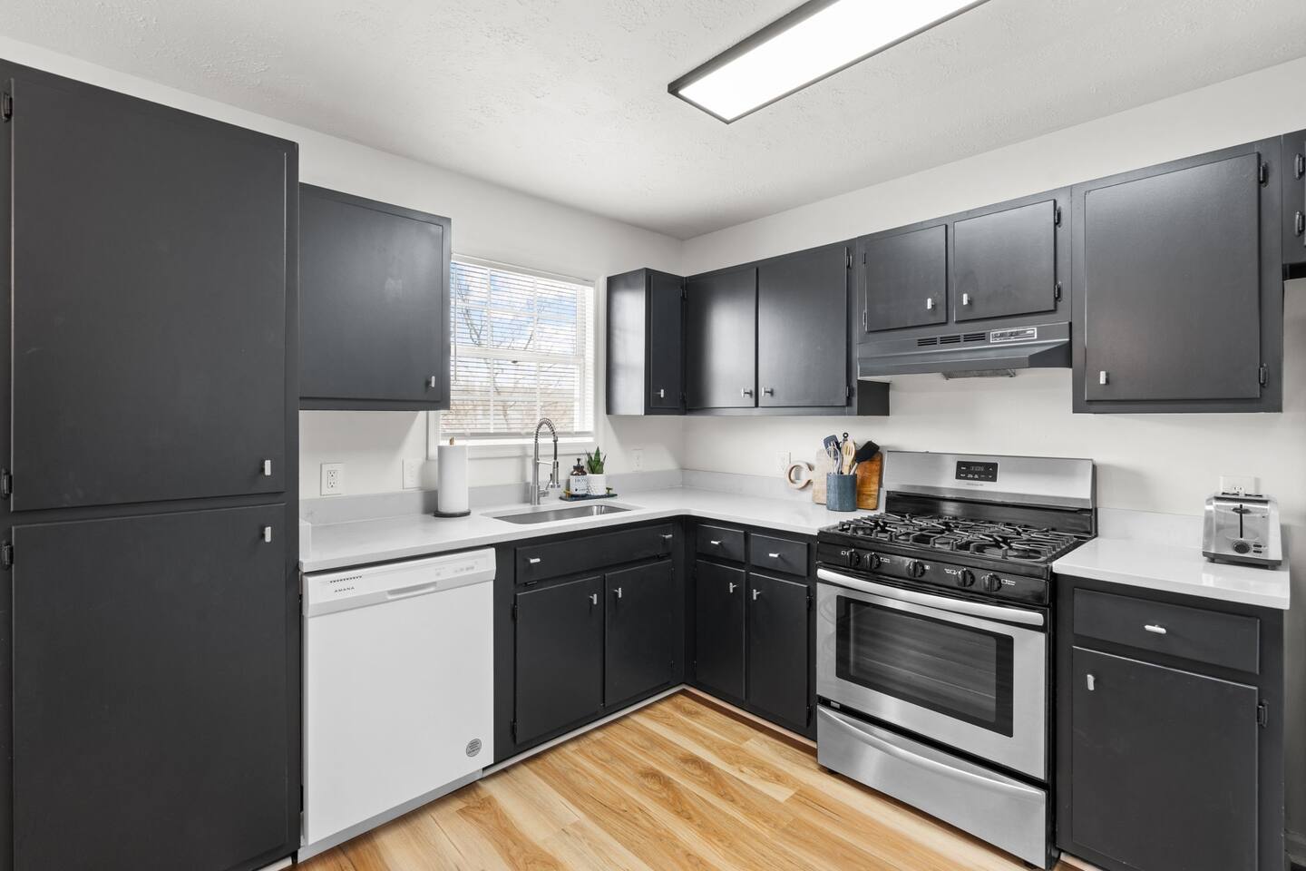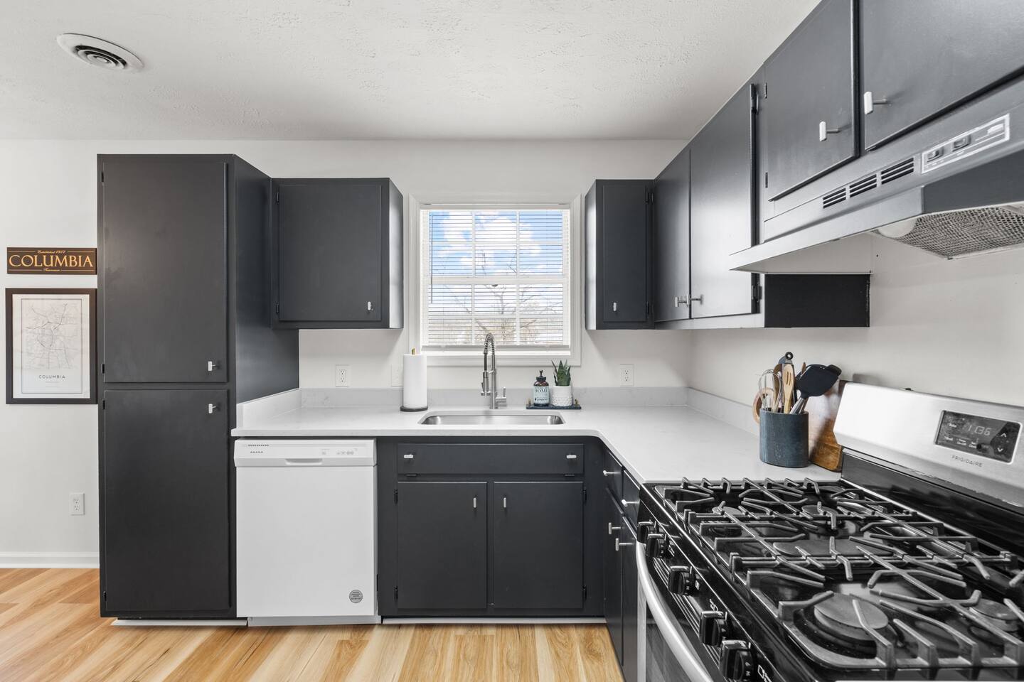 LIVING AREAS Your cozy Columbia cottage has nearly 1,100 square feet fully furnished and designed for your comfort. The newly furnished living room features fresh wood floors, eye-catching artwork, and a plush sectional. This space is perfect for socializing when you’re not out and about. It’s adjacent to the kitchen, so drinks and snacks are nearby, and the 50” Roku TV offers lots of streaming options including Netflix, Hulu, and Amazon Prime. KITCHEN & DINING Channel your inner chef in the spacious kitchen, outfitted with everything you may need to cook up something great. For our fellow caffeine addicts, a Keurig is provided. The kitchen offers an eat in area with seating for 4 and easy access to the deck. BEDROOMS & BATHS This home accommodates up to four guests between the two bedrooms. Each bed is appointed with luxury hotel bedding. The spacious master has a king-size bed. A 32” Roku TV invites you to watch your favorite shows from the privacy of your bedroom; stream from one of the many streaming services. The smaller (but still spacious) guest room has a comfy queen-size bed and is also equipped with a smart TV. The two bedrooms share a freshly updated bathroom with a tub and shower combo. OUTDOOR AREAS Sip drinks on the back deck or on the front porch. Your choice! EXTRA AMENITIES Additional perks include a washer/dryer and complimentary Wi-Fi. Garage parking is provided for two cars; if needed, the driveway also has abundant parking.